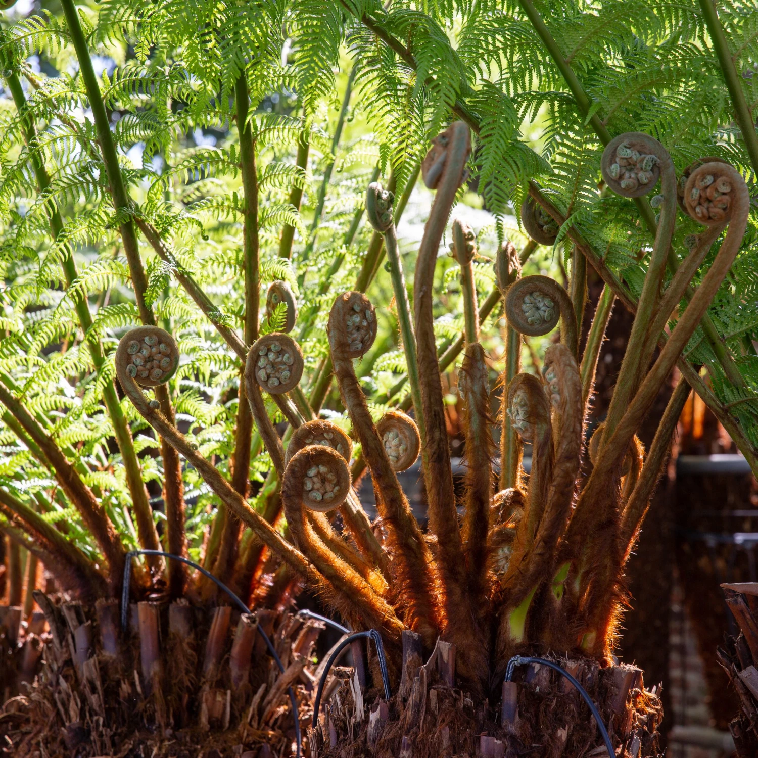 The easiest tree fern to cultivate in the UK, Dicksonia antarctica has spectacular crowns of huge, finely dissected foliage on magnificent broad fibrous trunks.