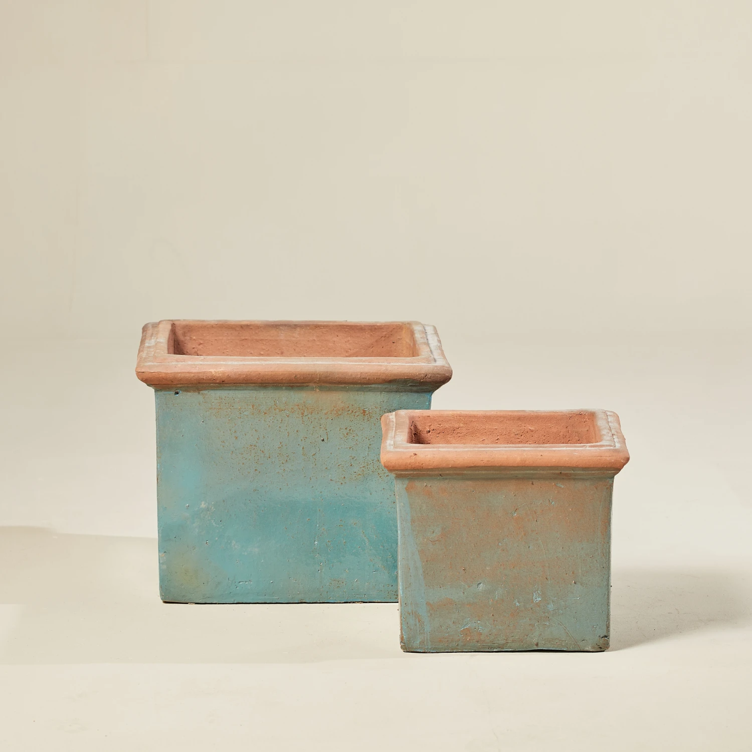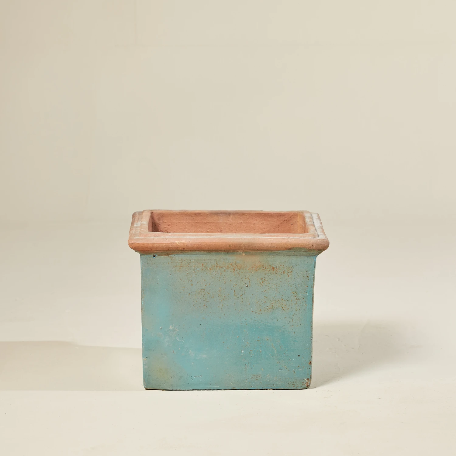 Genia Square pot is a beautifully crafted square planter, featuring a unique weathered turquoise finish that adds a touch of vintage elegance to any dรฉcor.