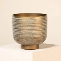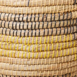 Issa is a family of two-textured pots, featuring coral-esque bottom halves and smooth glazed ceramic uppers, styled in horizontal rings. This Issa colouration is a deep yellow and brown.