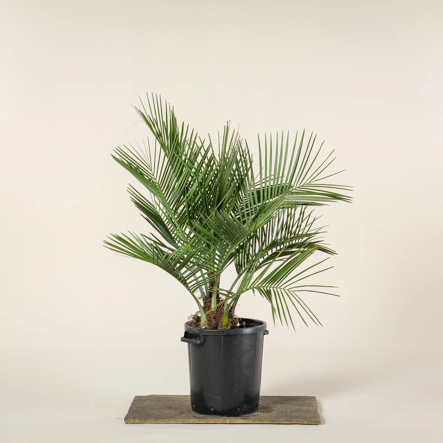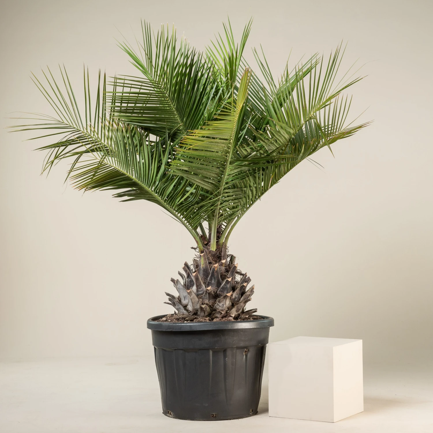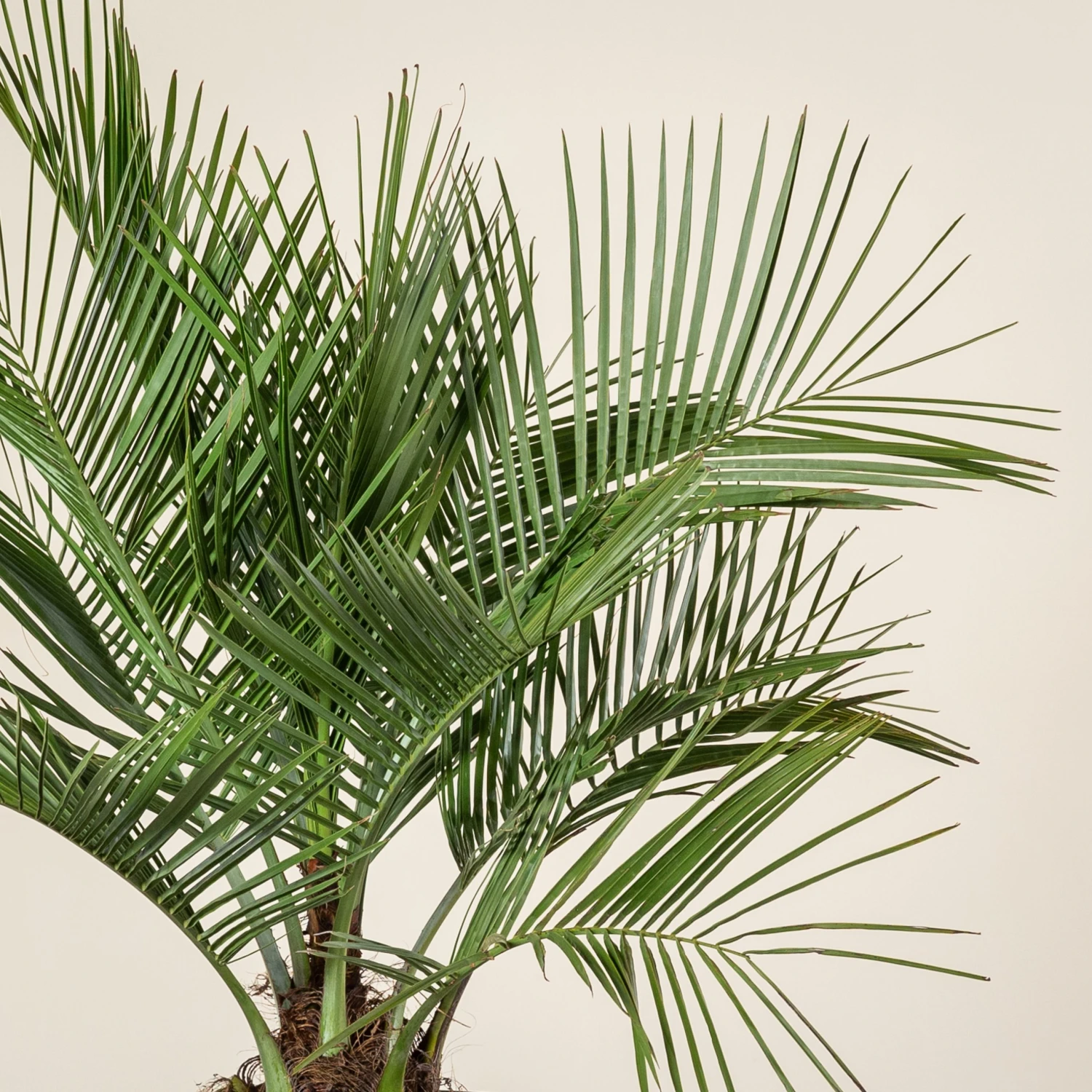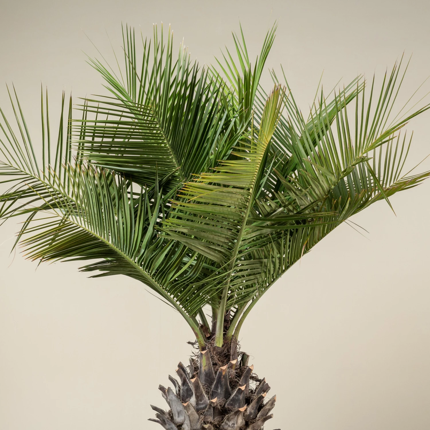 This hardy and striking species has the widest trunk of any palm, contrasting with the sweeping feathery fronds that sit atop it.