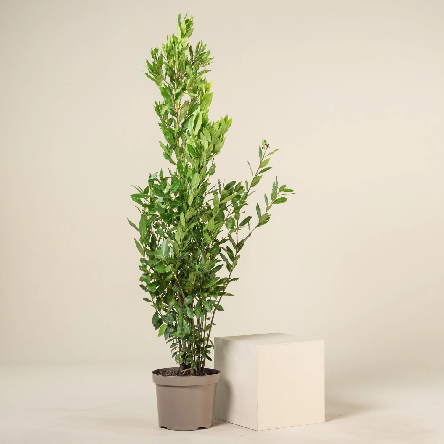 This Laurus nobilis is a medium sized bush form, shaped in a pyramid form, of the species which has grown in a natural, unpruned shape.