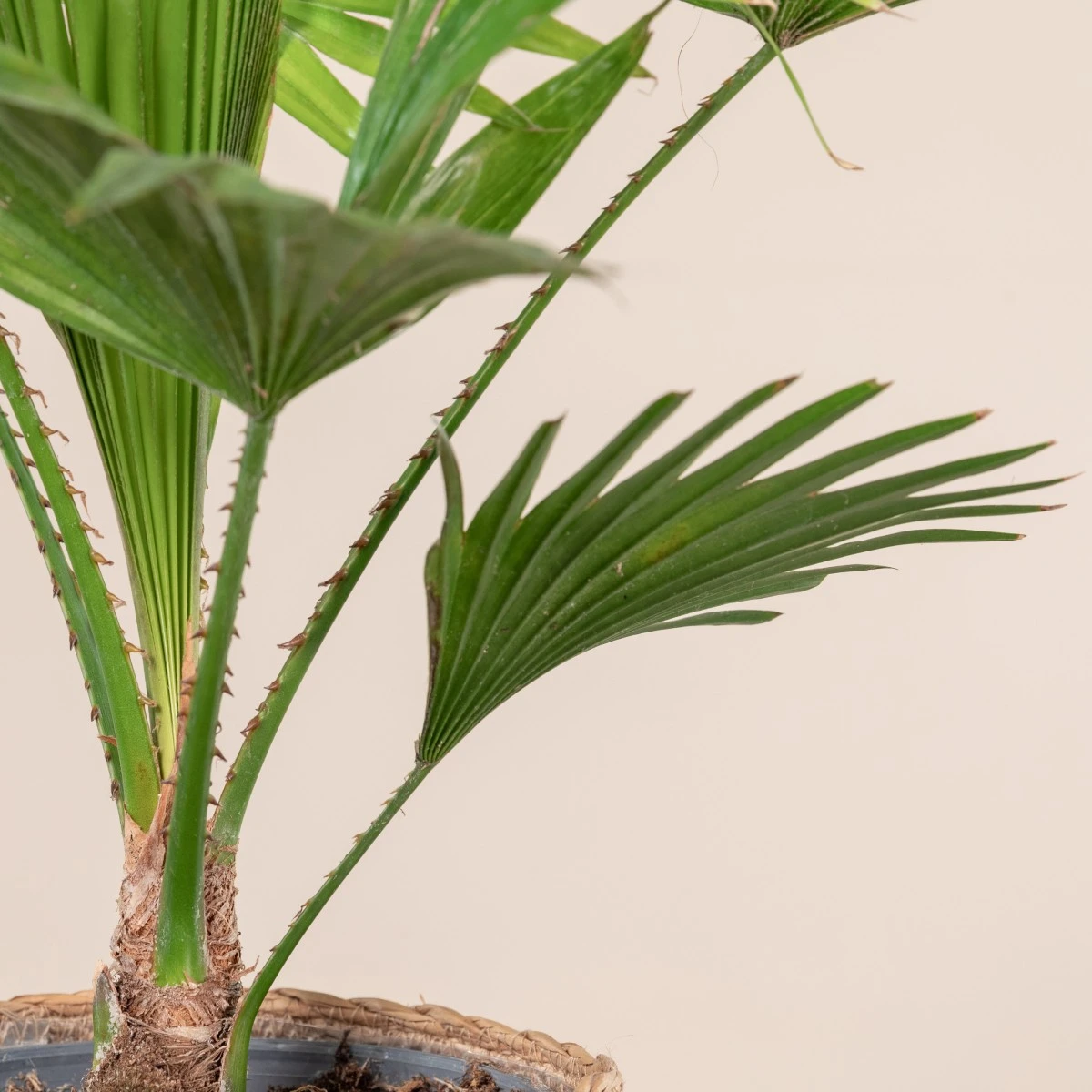 A gorgeous little gem of an indoor palm tree, with glossy palmate leaves, a miniature palm compared to other cousins of his.