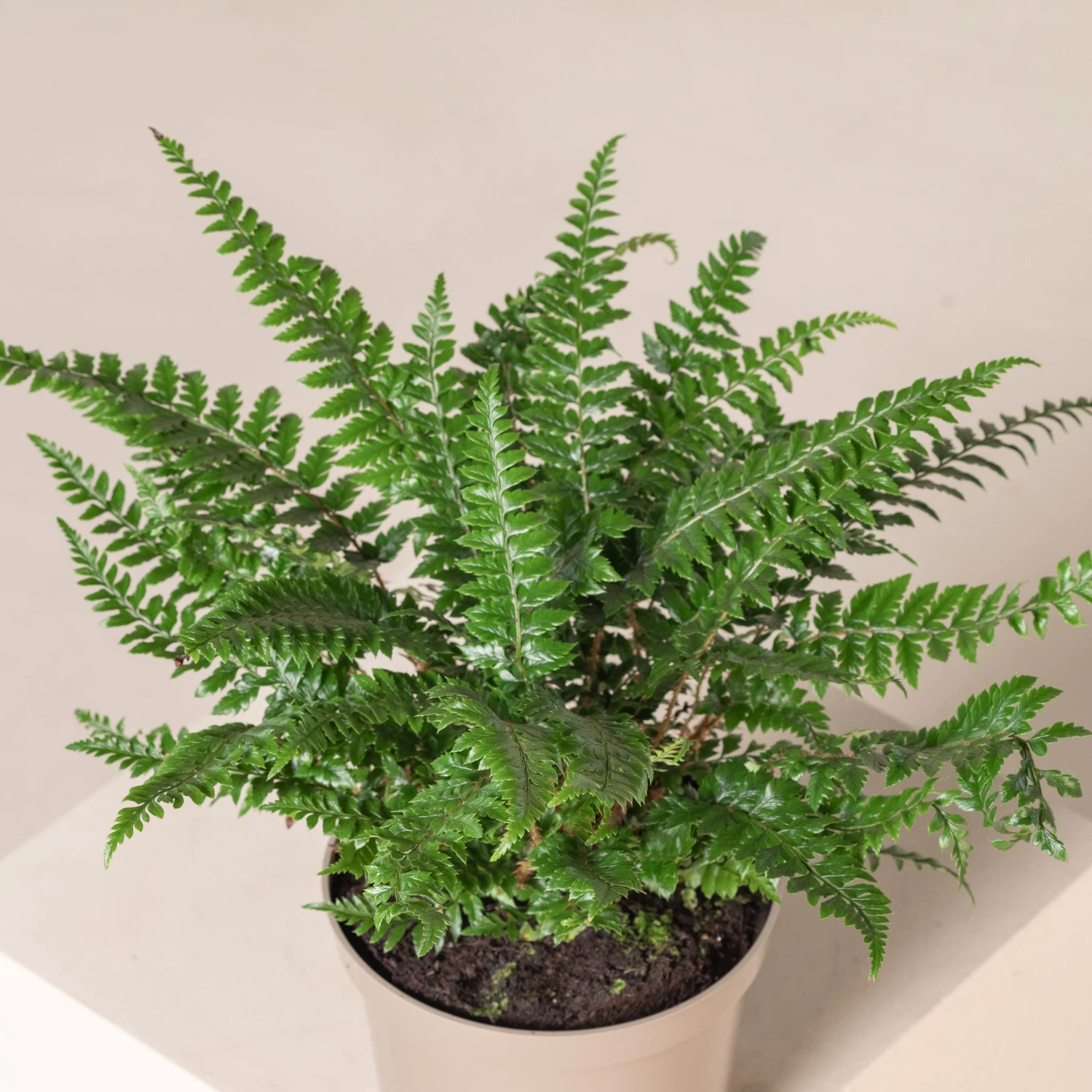 The Asian Sabre Fern is a tough and striking evergreen fern with dark lustrous foliage and midribs ornamented by coppery fur.