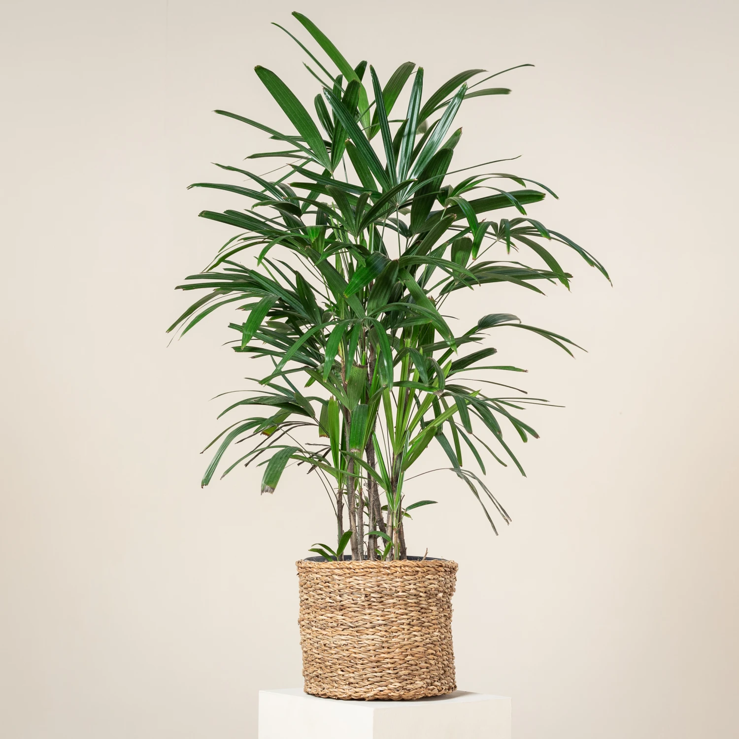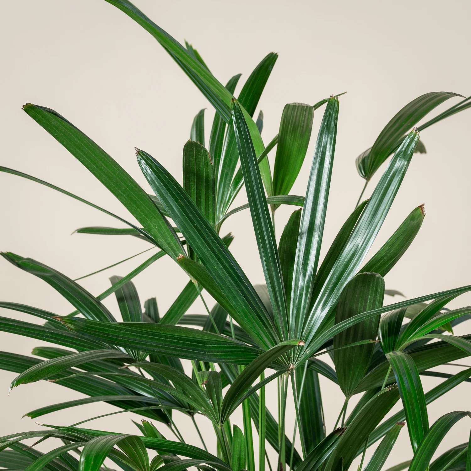 An attractive and easy to care for indoor palm, the Rhapis excelsa features thick fan shaped leaves which have characteristic saw-toothed blunt tips.
