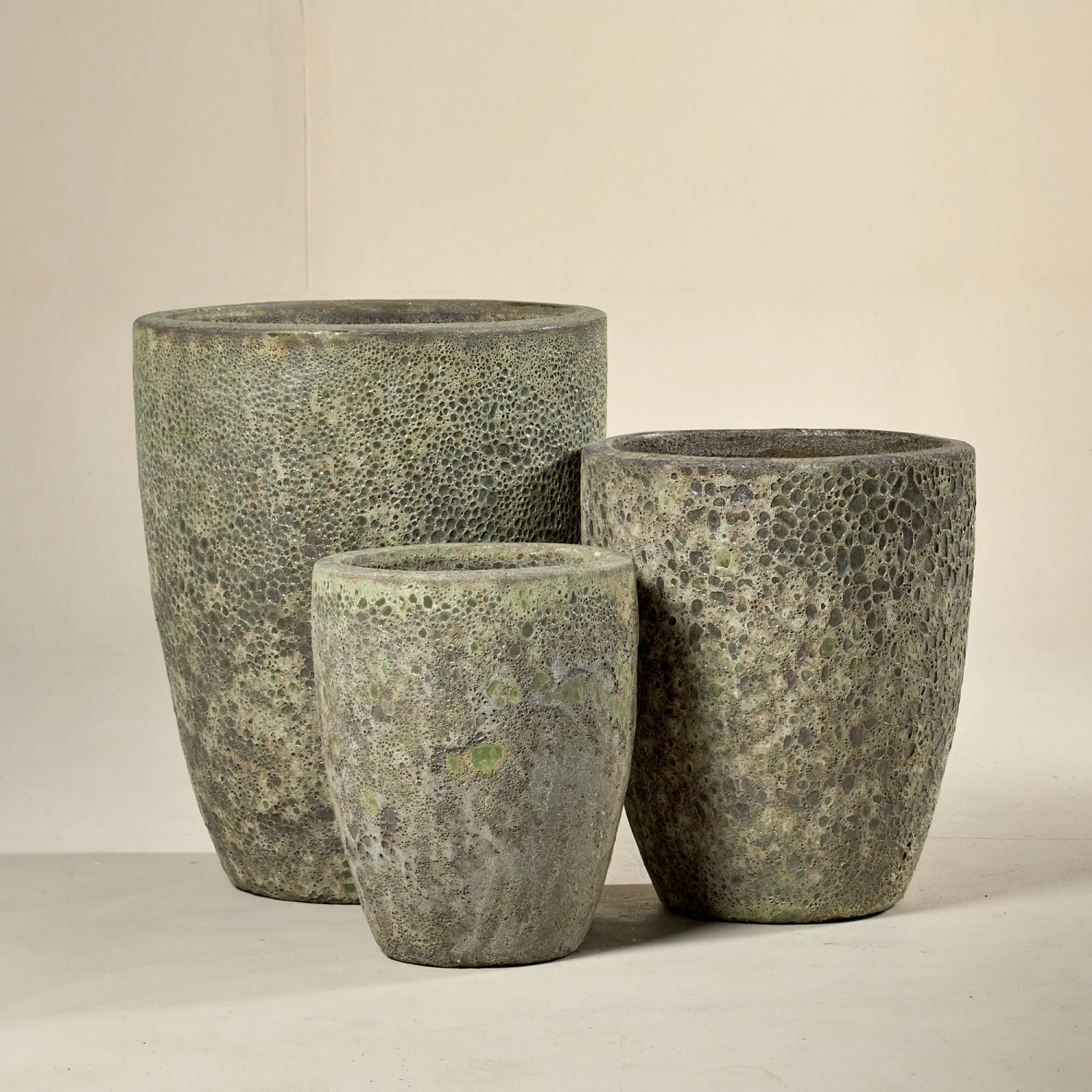 No two pots are identical and it is this organic nature that makes these pots work so well. The pumice-like finish is reminiscent of hardened lava which blends in with any natural environment and gives the illusion of the pot being an extension of the landscape, rather than something made by human hands.